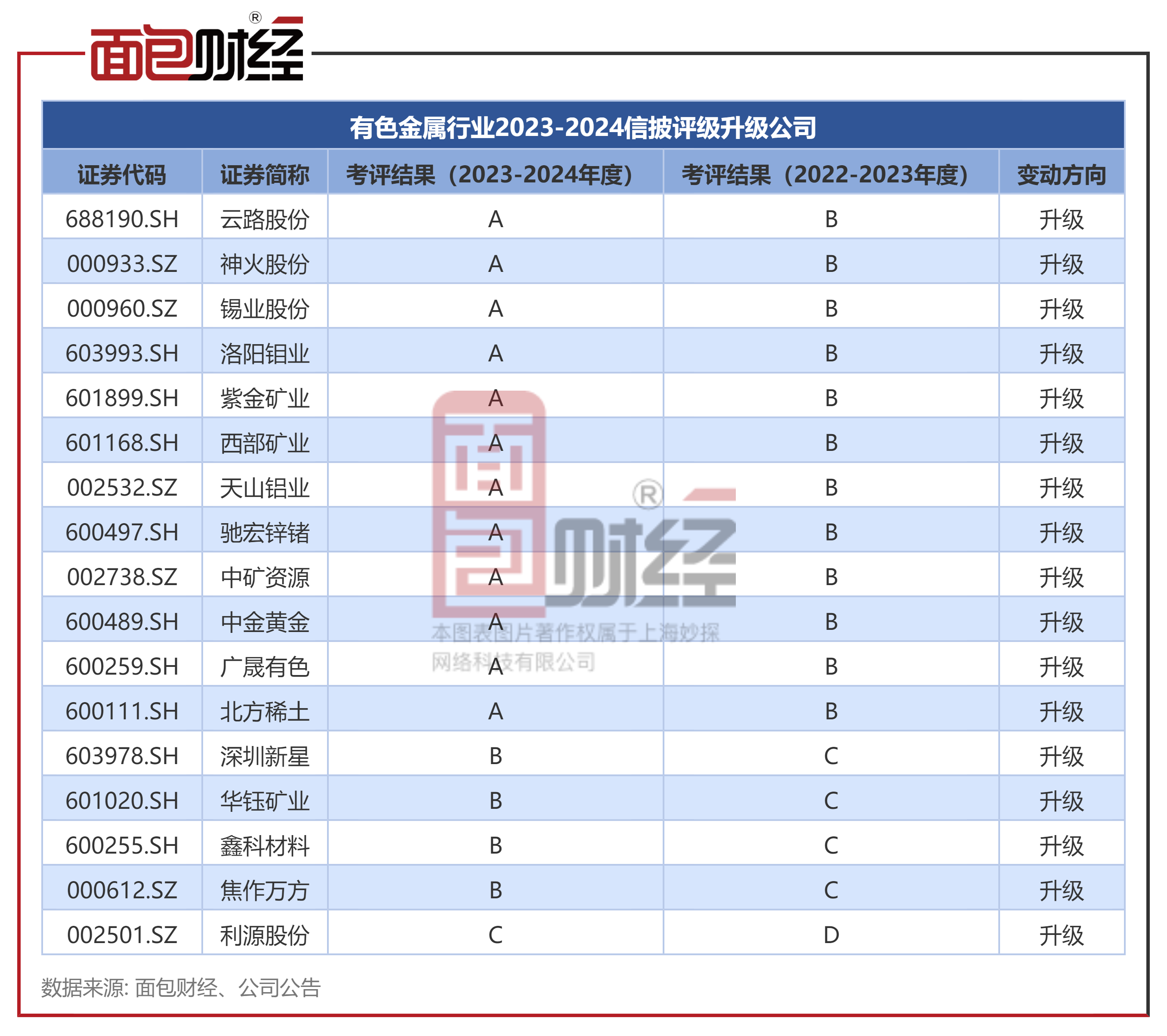 面包财经议论员阐明往返所近日线路的上市公司2023至2024年度信息线路责任评价后果进行整理议论,本篇为有色金属行业篇。
